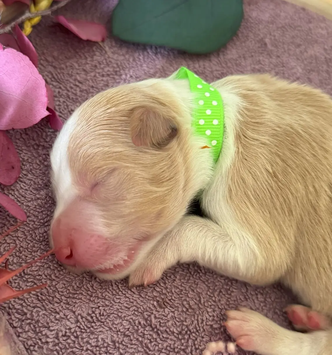 Deuxième à pointer le bout de sa truffe, Monsieur Vert affiche 295g de volonté, de rondeur et de caractère bien trempé. C’est un vrai costaud, le genre à se frayer un chemin en rampant par-dessus la fratrie, histoire d’être sûr qu’on ne l’oublie pas. Et s’il faut chanter un peu (beaucoup) pour appeler maman ? Il n’hésite pas une seconde !
